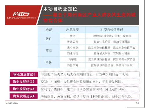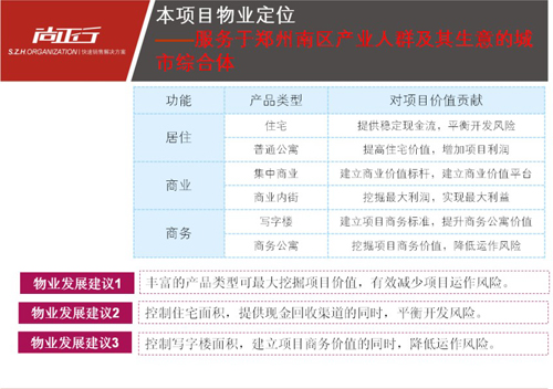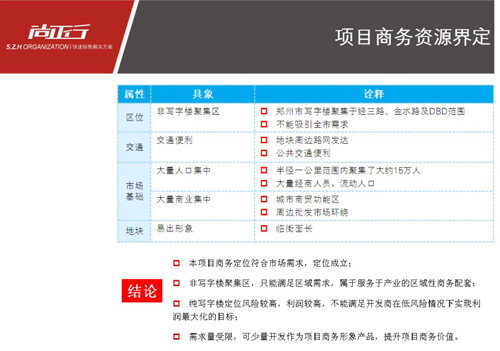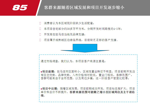 江泰置業(yè)鄭州市京廣路項目前期定位報告 項目位置:鄭州市京廣路與長江路交叉口西北角 項目規(guī)模:可規(guī)劃用地面積55畝 開發(fā)商:鄭州江泰置業(yè)有限公司 項目背景:城市商貿(mào)物流集中區(qū)域小規(guī)模項目開發(fā)。根據(jù)區(qū)域?qū)傩院晚椖繉傩匝芯?,結(jié)合物業(yè)發(fā)展方向分析,確定項目定位方向以及可發(fā)展物業(yè)配比。 博遠地產(chǎn)駐馬店市天中山大道項目定位及物業(yè)發(fā)展建議 項目位置:駐馬店市天中山大道與置地大道交叉口西南角 項目規(guī)模:可規(guī)劃用地面積150畝 開發(fā)商:駐馬店市博遠房地產(chǎn)開發(fā)有限公司 項目背景:城市發(fā)展方向及未來開發(fā)熱點區(qū)域,主干道旁中等規(guī)模高容積率開發(fā)項目。面臨土地成本高、市場供應量大、競爭突圍困難等難點,經(jīng)過對區(qū)域價值挖掘,設定區(qū)域發(fā)展的策略體系,透過區(qū)域策略有效實施,形成項目區(qū)域標桿型項目整體定位。 未來地產(chǎn)開封市汴西湖項目定位及物業(yè)發(fā)展建議 項目位置:開封市集英街金耀路交叉口 項目規(guī)模:可規(guī)劃用地面積117畝 開發(fā)商:鄭州未來房地產(chǎn)開發(fā)有限公司 項目背景:城市規(guī)劃中3000畝汴西湖區(qū)東側(cè),居住集中區(qū)域,有鄭汴融城概念。面臨主要問題是區(qū)域現(xiàn)有價值低,未來價值呈現(xiàn)不明顯,市場供大于求等情況,通過區(qū)域?qū)傩耘c項目屬性深入梳理,確立項目核心競爭力,制定完善的價值體系,結(jié)合產(chǎn)品策略制定開發(fā)分期策略,建立項目高端品質(zhì)感。