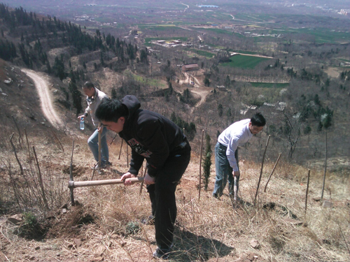 不管環(huán)境有多艱苦,我們還是完成了每人三棵的植樹任務(wù),看著被我們精心栽種好灌