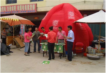 這是第二小組在苗店鎮的巡展點,司機和派單大姐在幫助我們布置好展位后,第一時間就開始向附近的商戶宣傳!