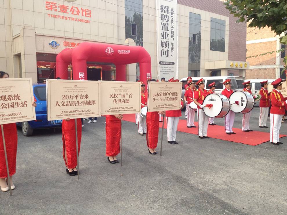 十一假日期間第一公館銷售中心組織了假日巡游活動,巡游活動中走在隊伍前面的是氣勢磅礴的軍樂隊;接下來則是清一色身高超過165cm的空乘專業禮儀小姐身著紅色旗袍,手拿手舉牌;隊伍尾端為我們的優秀派單員向四周商戶以及圍觀群眾分發單頁。每天巡游隊伍里都會有我們的置業顧問,向客戶隨時講解。
