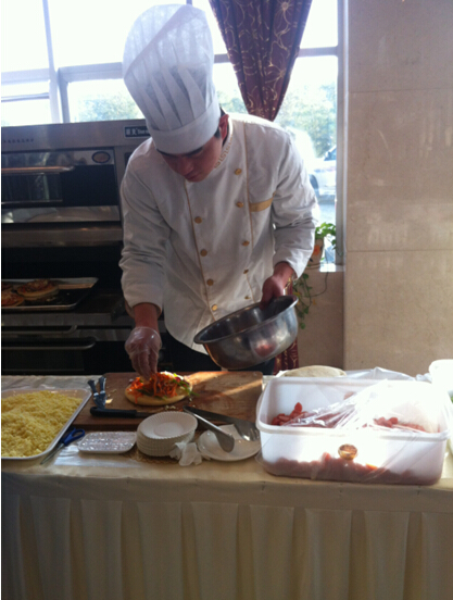受邀客戶們認(rèn)真觀看披薩師傅的示范,仔細(xì)學(xué)習(xí)制作工藝和需要注意的方面。拌好配料,仔細(xì)均勻的撒在披薩面皮上。接下來披薩師傅將已經(jīng)準(zhǔn)備好的碎芝士撒勻,要注意芝士的量不能過多,否則就會很膩,也不能太少,這樣會烤糊,同時一定要注意要撒均勻,不然烤好之后是不會拉絲的。