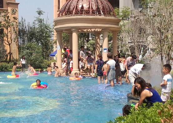 景觀區里的游泳池成了小朋友的天堂,小朋友們個個欲想成為“游泳健將”在水里自由拍打,不時傳來天真無邪銀鈴般的笑聲。