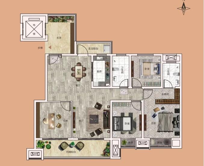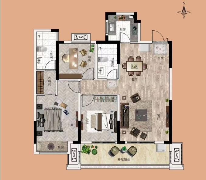 ②南北雙陽(yáng)臺(tái),修身養(yǎng)性區(qū),家政區(qū)、健身區(qū),雜物放置區(qū),滿足家人不同需求;